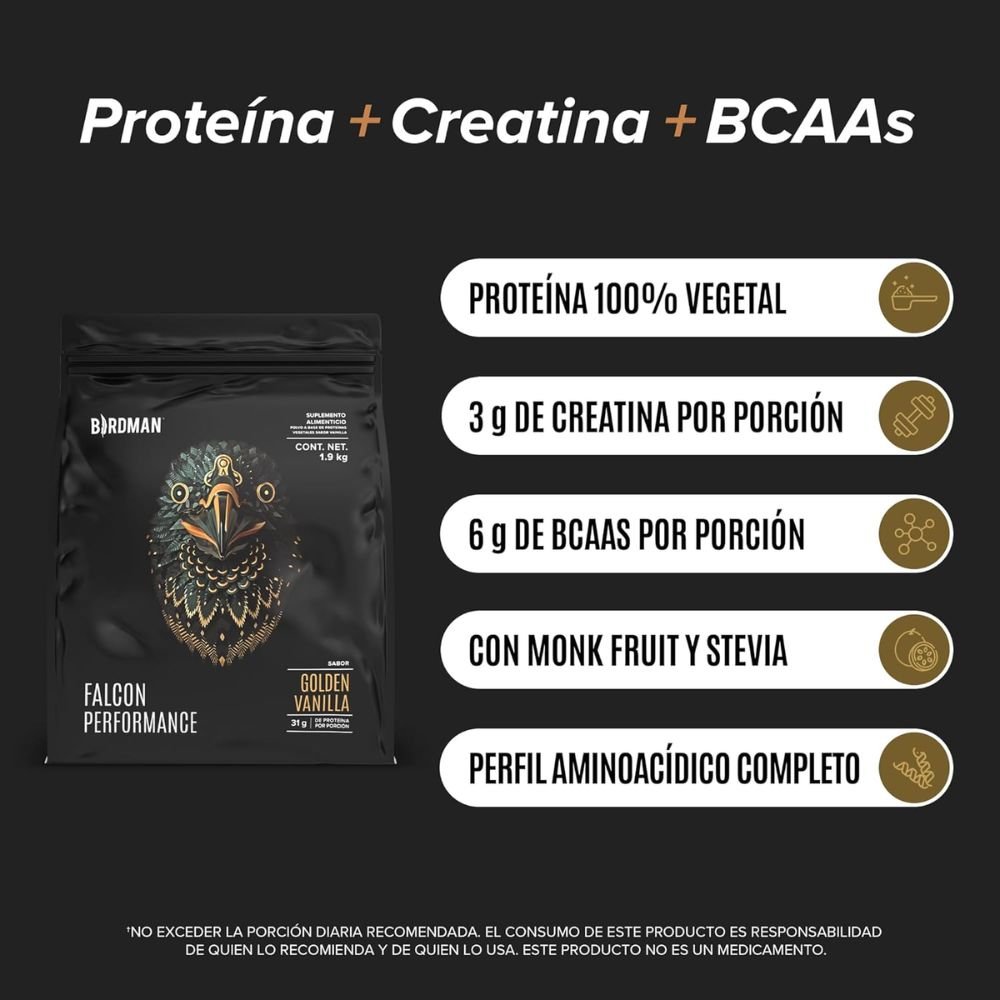 Birdman Falcon Performance es la elección perfecta para atletas y personas activas que buscan maximizar su rendimiento físico y cognitivo de manera natural y sin efectos secundarios indeseados. Esta fórmula avanzada combina 30 g de proteína vegetal premium y 3 g de creatina monohidratada por porción, ofreciendo el equilibrio ideal entre desarrollo muscular, energía y recuperación.