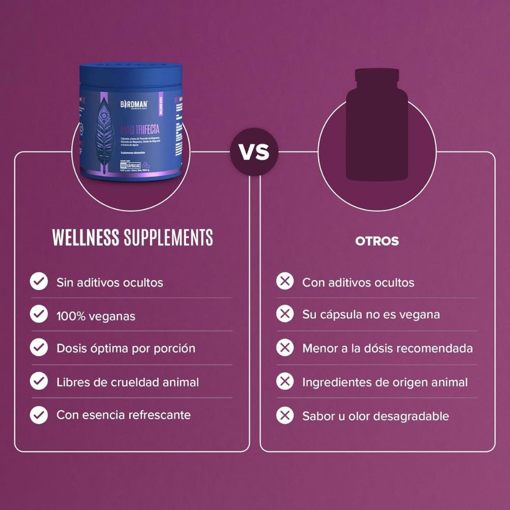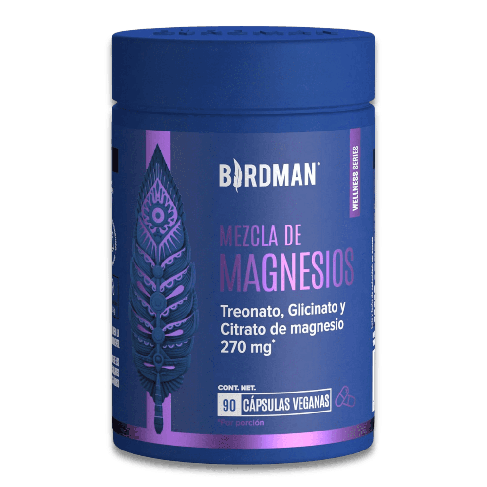 Birdman Mezcla de Magnesios combina tres de las formas más efectivas de magnesio: treonato, glicinato y citrato de magnesio, ofreciendo un suplemento completo que apoya la salud física y mental de manera natural. Esta fórmula limpia, sin aditivos y 100% vegana, está diseñada para una alta biodisponibilidad, lo que significa que tu cuerpo absorbe mejor cada miligramo de magnesio.