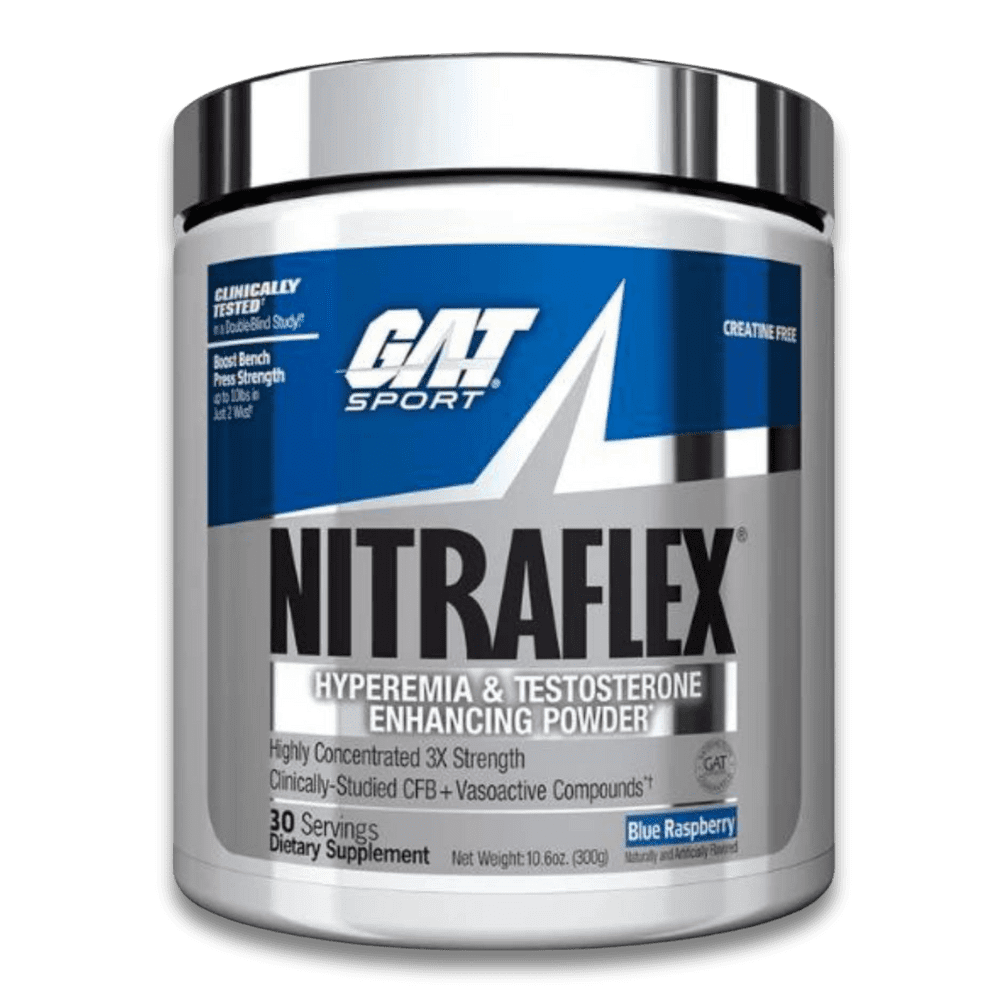 Suplemento GAT Sport Nitraflex sabor Blue Raspberry, pre entreno con refuerzo de testosterona, energía y enfoque para entrenamientos intensos.GAT Sport Nitraflex Pre Entreno 30 Servicios | Energía, Fuerza y Testosterona Natural | Varios Sabores