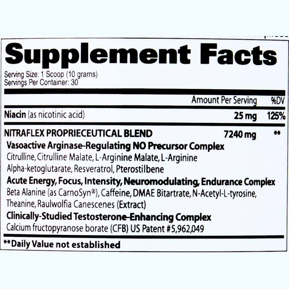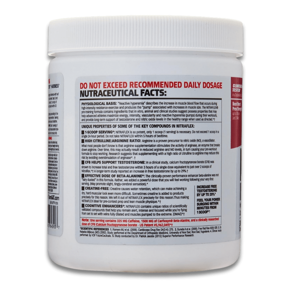 Cada servicio de nitraflex contiene una mezcla exclusiva de 7240 mg con ingredientes activos como beta-alanina CarnoSyn®, citrulina, arginina, cafeína anhidra, DMAE y el innovador calcio fructoborato (CFB), un compuesto clínicamente estudiado que apoya la producción natural de testosterona.