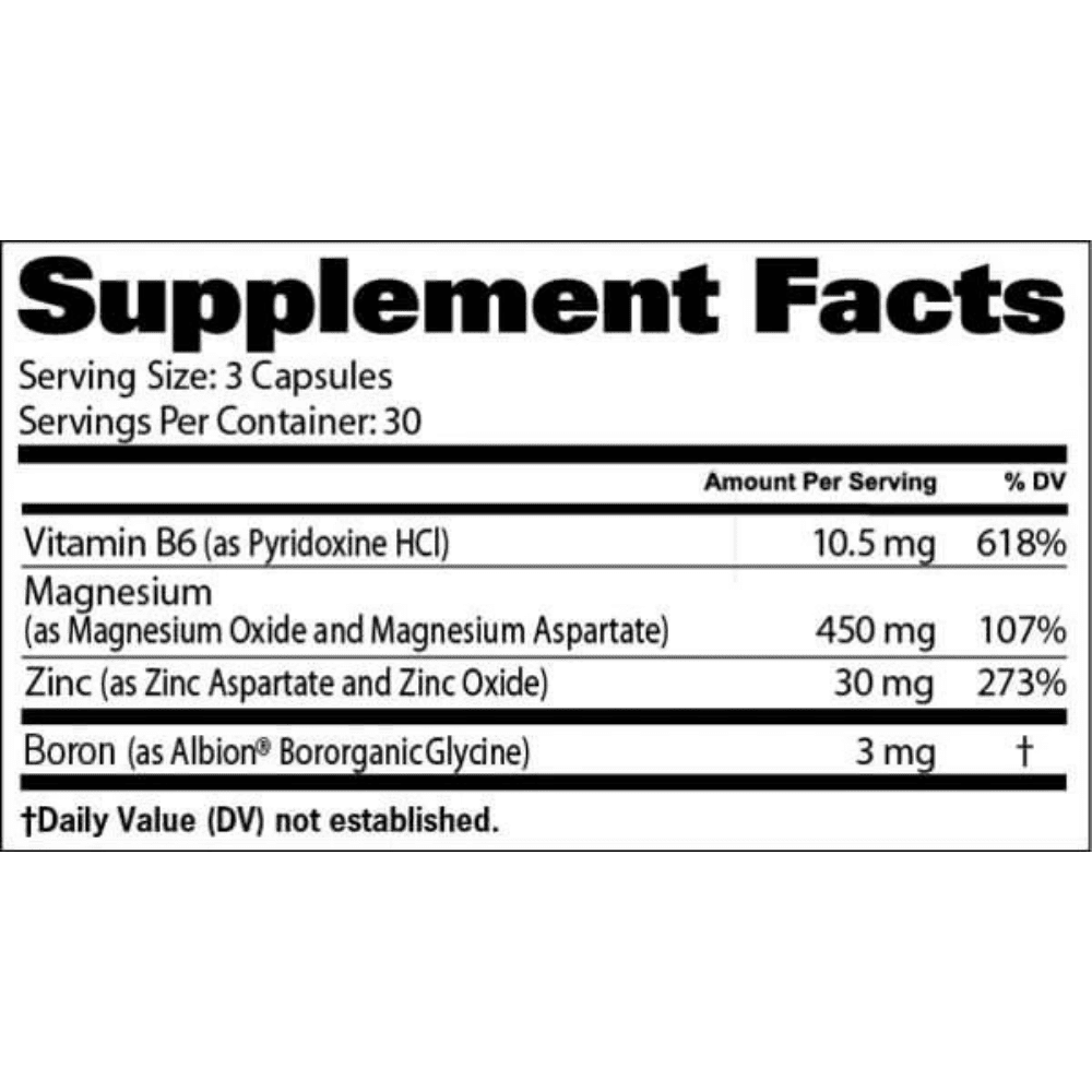 Cada cápsula vegetal contiene una dosis óptima de vitamina B6 (10.5 mg), magnesio (450 mg), zinc (30 mg) Y boro (3 mg), ingredientes clínicamente estudiados que contribuyen a la producción natural de testosterona, el Rendimiento deportivo y la recuperación post-entrenamiento.