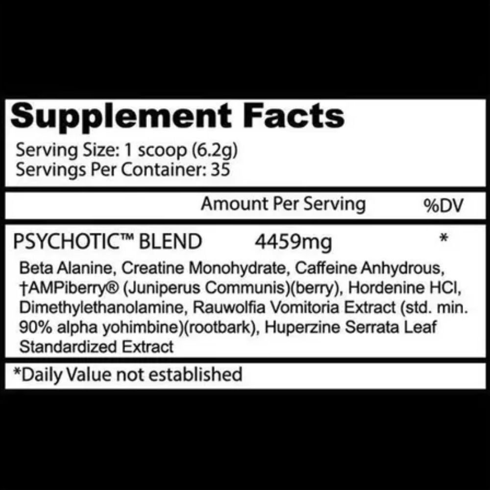 Cada sobre contiene la exclusiva Psychotic Blend (4459 mg) con ingredientes de alto rendimiento como beta alanina, creatina monohidratada, cafeína anhidra, AMPiberry®, hordenina HCI, extracto de Rauwolfia Vomitoria (90% alfa yohimbina) y Huperzine Serrata, garantizando un pre workout de máxima intensidad.