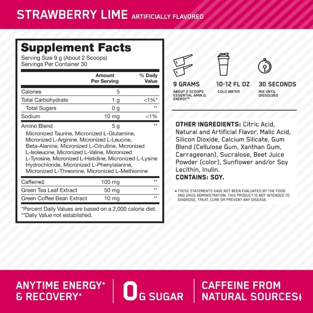 Optimum Nutrition Amino Energy 30 Porciones es un suplemento diseñado para quienes buscan más energía, resistencia y recuperación muscular en su día a día 💪⚡. Su fórmula combina aminoácidos esenciales, cafeína natural de té verde y café verde, además de contener 0 g de azúcar, lo que lo convierte en una opción limpia y efectiva tanto para pre-entrenamiento como para usar en cualquier momento del día.