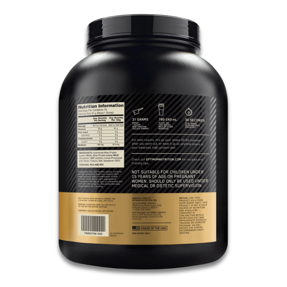 Disponible en sabores irresistibles como Rich Vanilla, Chocolate Bliss y Strawberry 🍨🍫🍓, Gold Standard 100% Isolate ofrece una experiencia de sabor premium mientras aporta nutrición avanzada para atletas, culturistas y personas que buscan resultados reales.